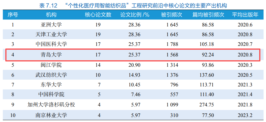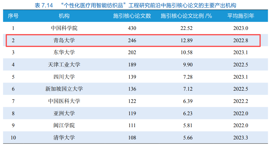 3月25日,中国工程院发布《2025全球工程前沿》报告,青岛大学成功入选“个性化医疗用智能纺织品”工程研究前沿中施引核心论文的主要产出机构榜单,位列全球第2;成功入选核心论文的主要产出机构榜单,位列全球第4。