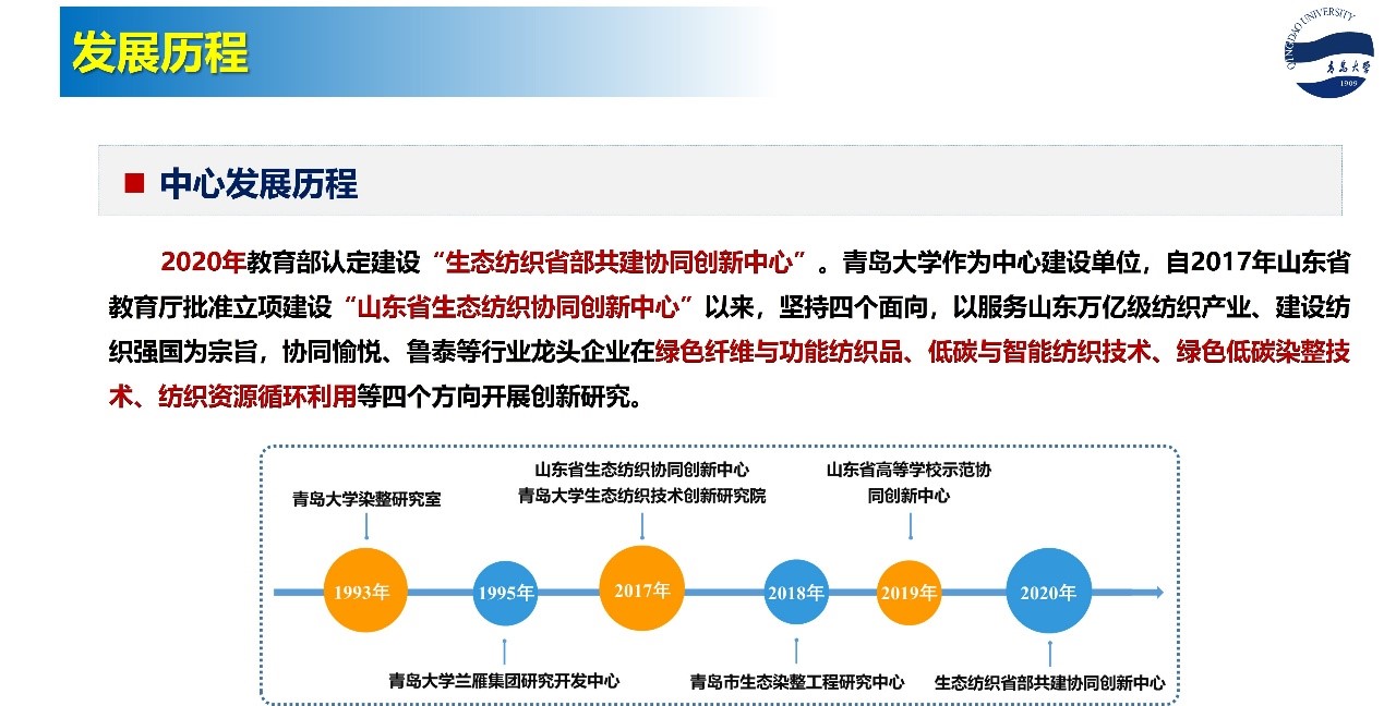 生态纺织省部共建协同创新中心是国内生态纺织领域一流的科研创新平台,自中心成立以来,面向世界科技前沿、面向经济主战场、面向国家重大需求、面向人民生命健康,以服务山东万亿级纺织产业、建设纺织强国为宗旨,协同省内外行业龙头企业在绿色纤维与功能纺织品、绿色低碳染整技术、纺织资源循环利用、生物医用纺织材料等四个方向开展创新研究。