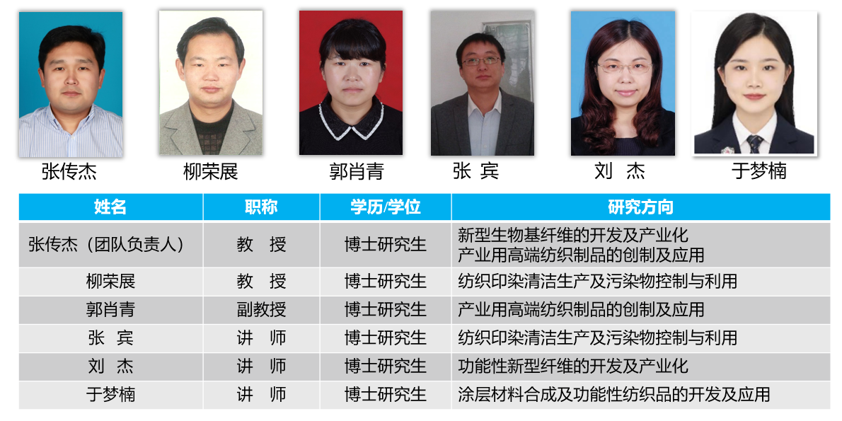 中心现有教师6人,其中教授2人、副教授1人、讲师3人,研究方向各有侧重且形成深度互补。近年来,中心承担多项国家级、省部级课题,与行业龙头企业合作多项横向课题,合同经费累计超千万元,多项技术成果实现产业化落地,是纺织、材料、化工、环境等多学科交叉融合的理想科研平台。