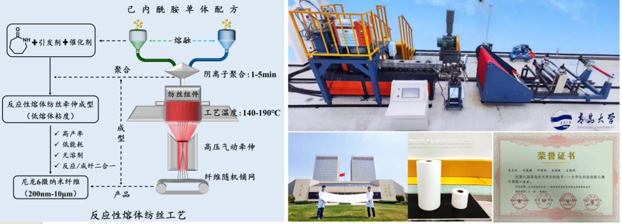 微纳米纤维短流程绿色低碳制备技术:本团队以高通量、低能耗制备超细纤维非织造材料为目标,自主设计开发了一种新型的反应性熔体纺丝(RMS)技术。相比于目前主流的微纳米纤维加工方法,RMS技术具有工艺成本低、生产效率高、设备投资少、绿色无污染等诸多优势,为高性能纤维材料的设计、制备及应用提供了全新思路。应用案例:尼龙6微纳米纤维材料的高效制备。