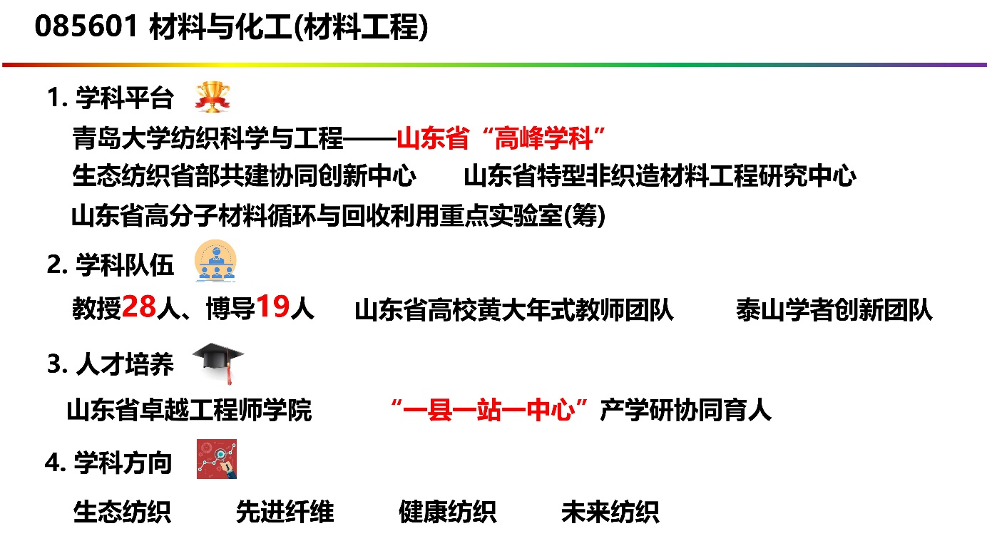 依托青岛大学纺织科学与工程学科(山东省“高峰学科”),建有生态纺织省部共建协同创新中心、山东省高分子材料循环与回收利用重点实验室(筹)、山东省特型非织造材料工程研究中心等平台。聚焦先进纤维、绿色低碳等领域共性技术,培养高层次应用型人才。